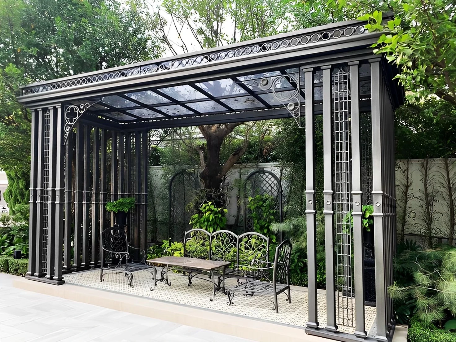 โครงเหล็กดัดลวดลายคลาสสิกผสมไม้ระแนง หรือจะเป็นศาลานั่งเล่นสไตล์งานเหล็กดัด (GAZEBO) ที่ช่วยเพิ่มความหรูหราแบบผู้ดีอังกฤษ